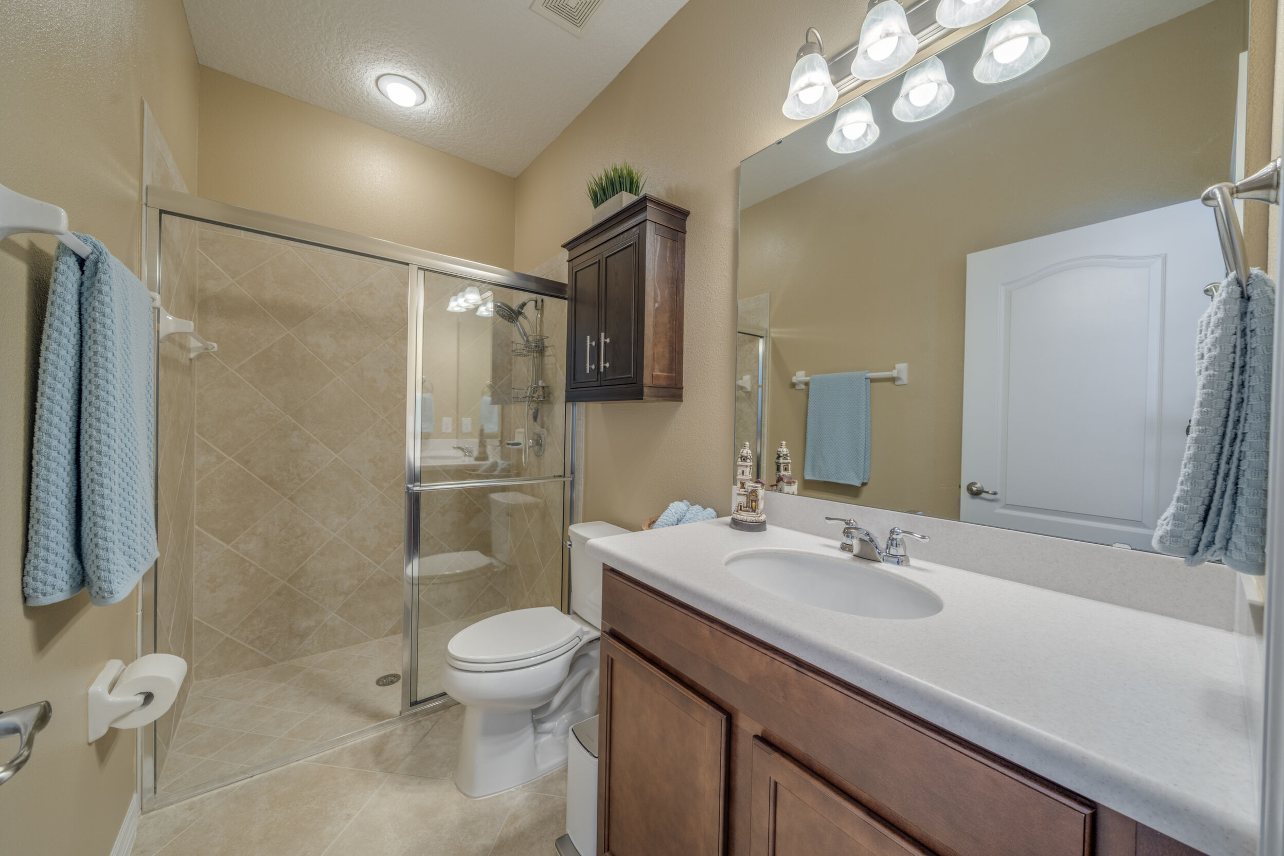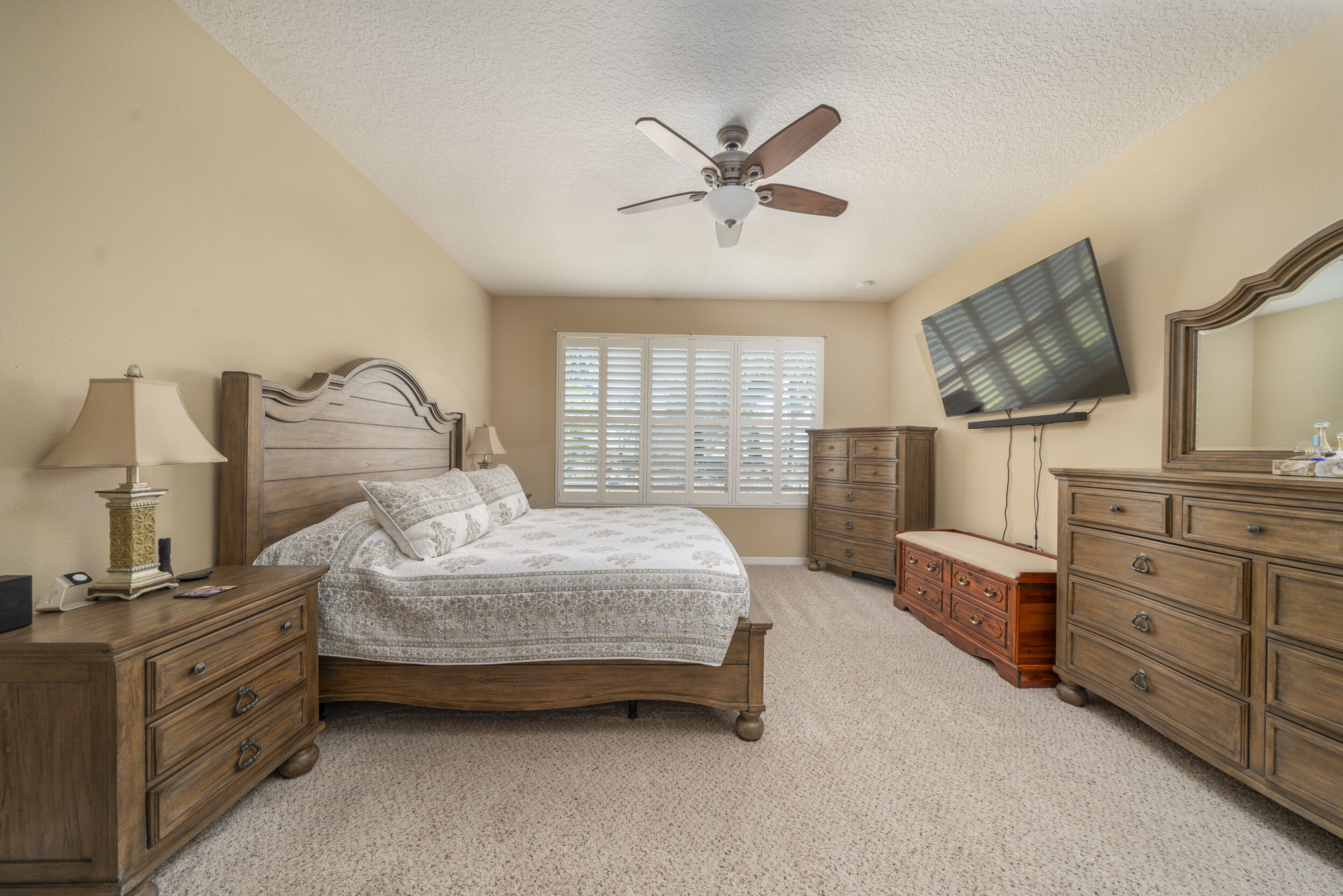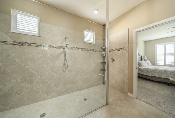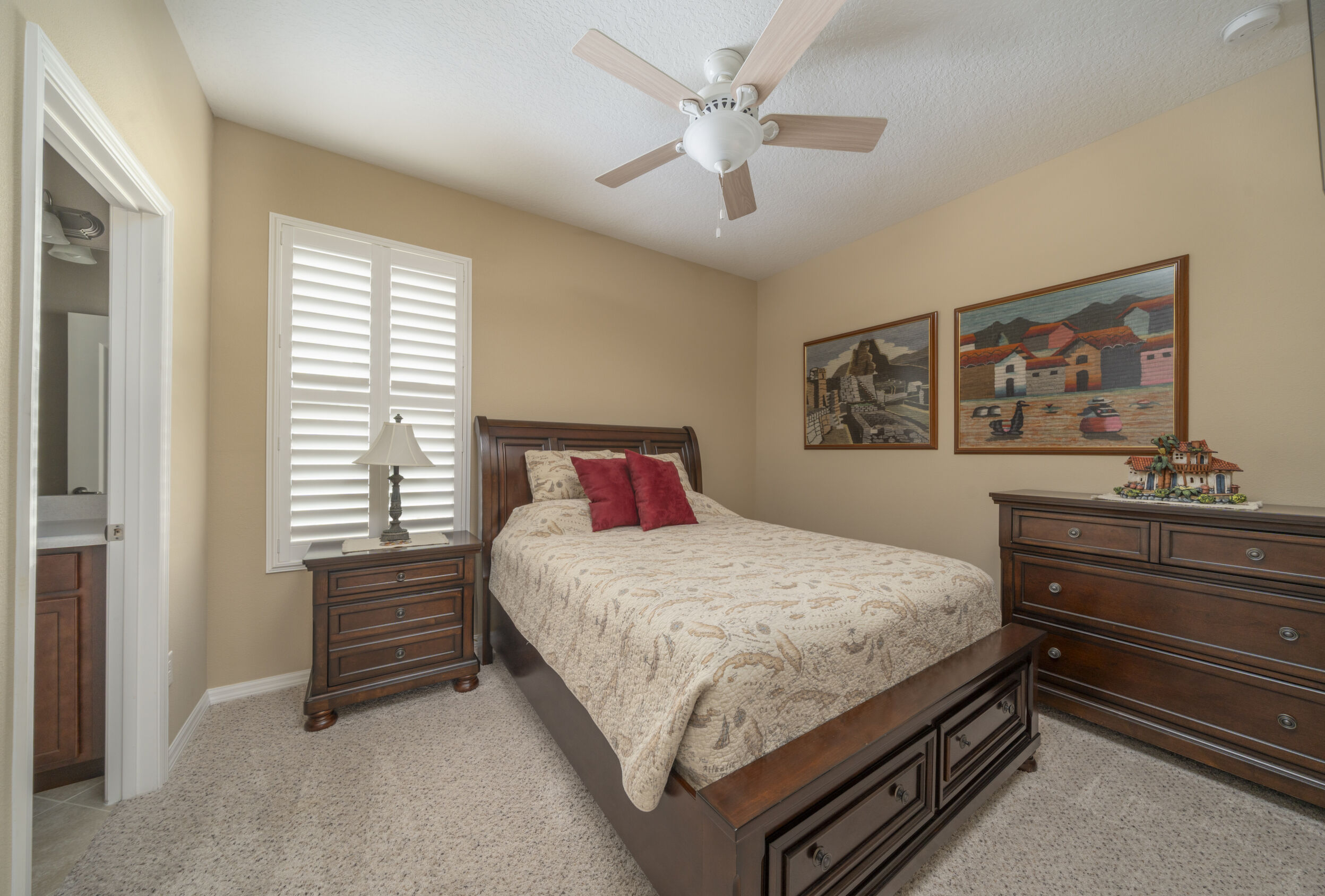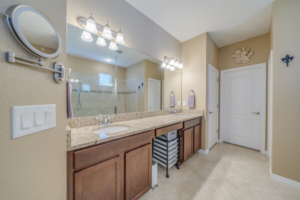 The primary bedroom is a peaceful retreat, boasting a spacious en-suite bathroom that includes dual sinks, a walk-in shower, and a huge closet, providing ample storage and a touch of luxury.